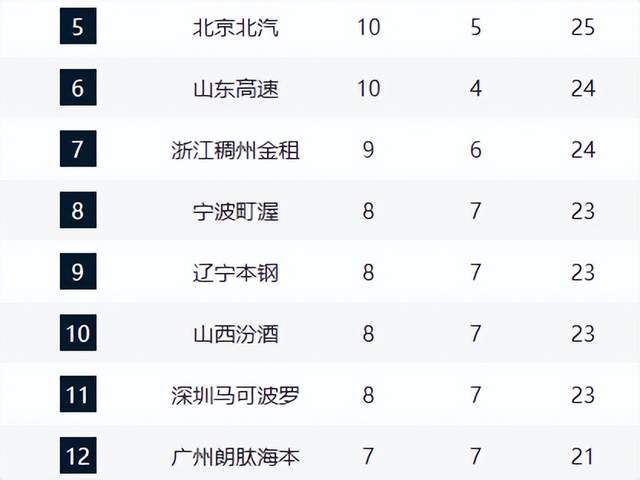 积分榜前三名依旧由广厦、上海和广东三队把持。卫冕冠军广厦队凭借一波4连胜,以13胜2负的战绩独占鳌头,领先广东队1个胜场。上海队以12胜3负的战绩紧随其后,位列第2名。广东队则在上一轮40分惨败给上海队后,战绩同为12胜3负,但因交锋战绩劣势暂居第3名。
